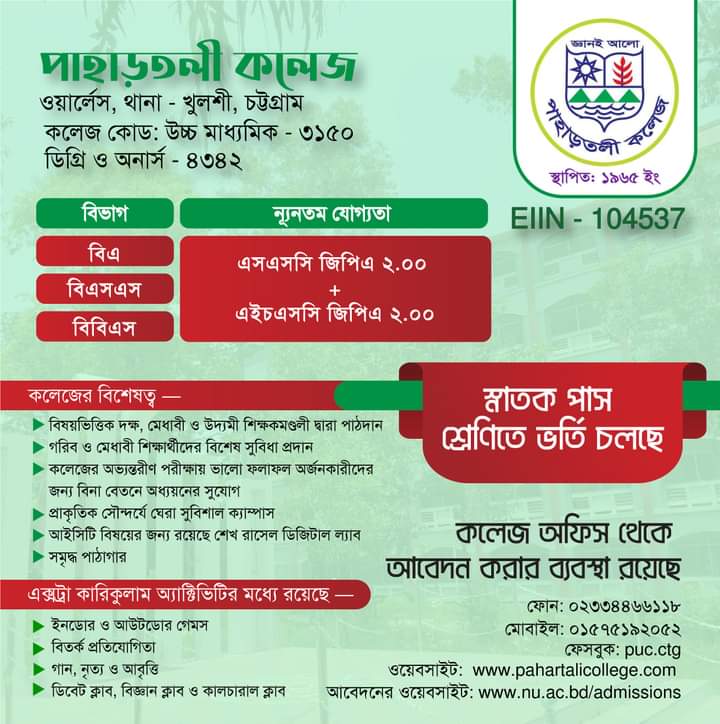 College Code : 3150 Wireless, Pahartali, Chattogram; 02-334466118, 01575-192052